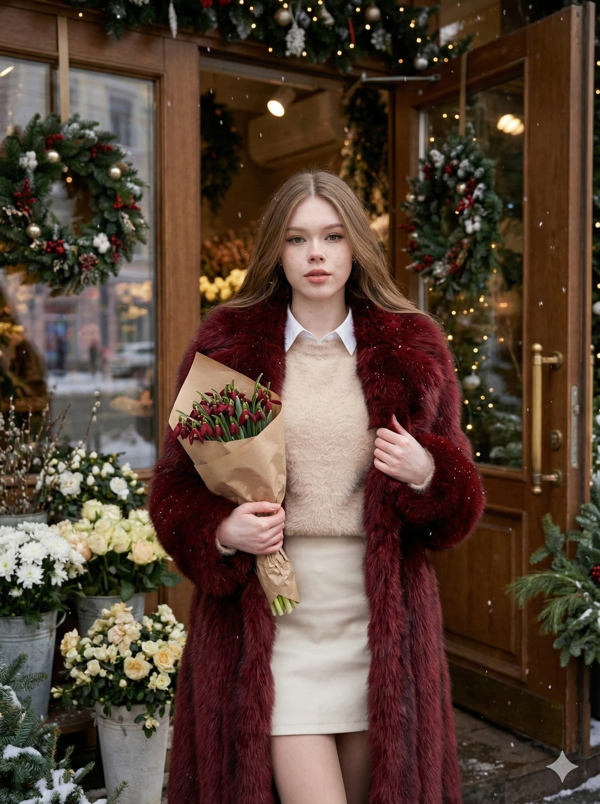2.Photorealistic Ultra-realistic winter street portrait. Keep the woman’s real face, facial structure, expression, and proportions exactly as in the reference — identity lock. She stands outdoors at the entrance of a European-style flower shop decorated with Christmas wreaths, garlands, soft warm lights and winter floral arrangements. Snow is gently falling around her. Her outfit matches the reference precisely: a light cream mini skirt, a soft beige fluffy sweater layered over a white collared shirt with the collar visible, and a long voluminous dark red fur coat with thick, rich texture. In her hand she holds a bouquet of fresh dark red snowdrops wrapped in brown kraft paper. Her pose is natural and relaxed — one hand adjusting the coat, the other holding the bouquet, posture confident but effortless. Background: wooden shop doors, Christmas greenery, wreaths with warm lights, potted winter flowers in soft whites and pale yellows placed around the entrance. A subtle city street atmosphere is visible behind the glass. 3:4